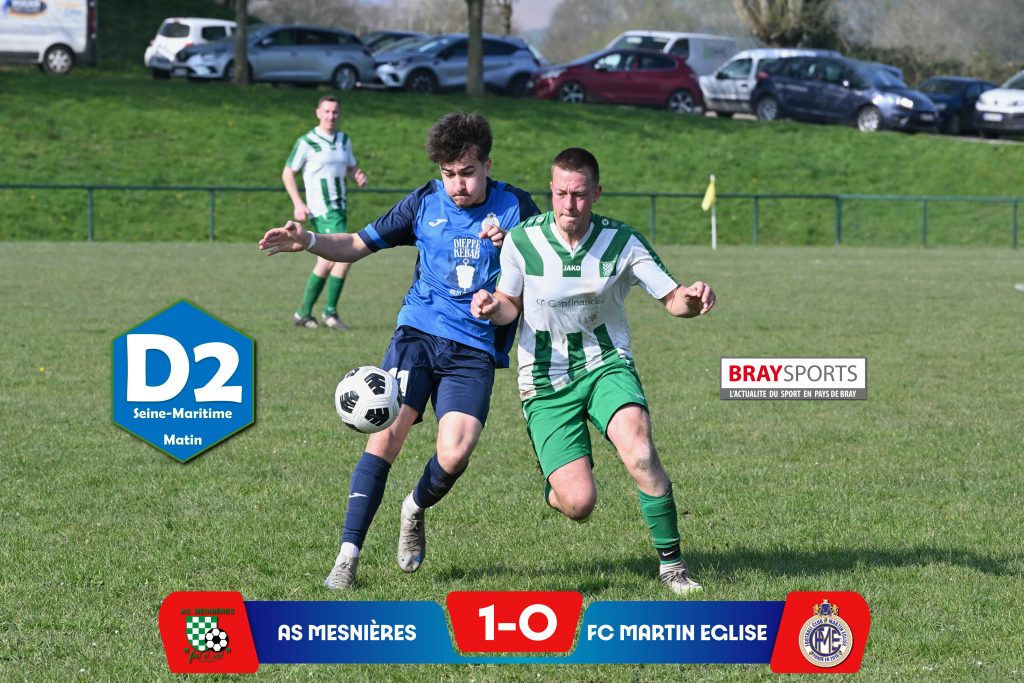 Ce dimanche 22 mars 2026, l’AS Mesnières-en-Bray accueillait le FC Martin-Église dans le cadre de la 16ème journée du championnat de D2 groupe A. Dans des conditions de jeu difficiles, les deux équipes ont livré une rencontre engagée, marquée par un terrain très compliqué et de nombreuses interruptions.