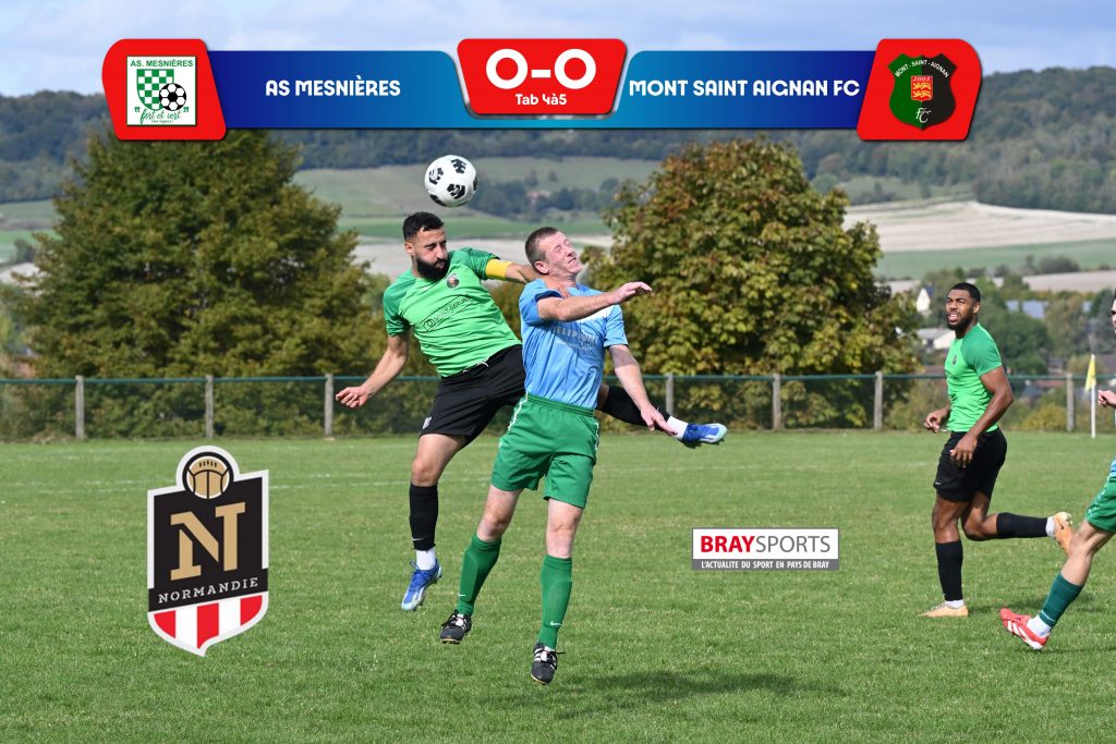 Dimanche 28 septembre 2025, le stade du Rambure de Mesnières-en-Bray a vibré au rythme de la Coupe de Normandie seniors. Pour ce 2ᵉ tour, l’AS Mesnières (D2) recevait le Mont-Saint-Aignan FC, solide pensionnaire de Régional 3, soit deux divisions au-dessus. Et les Mesnièrois ont bien failli créer la surprise.