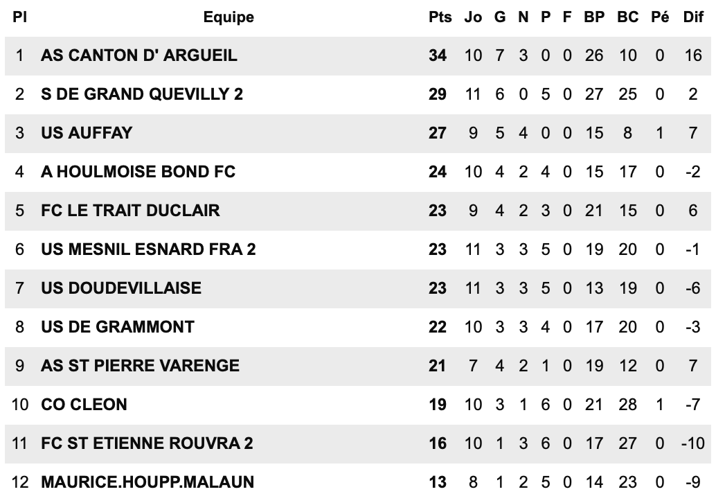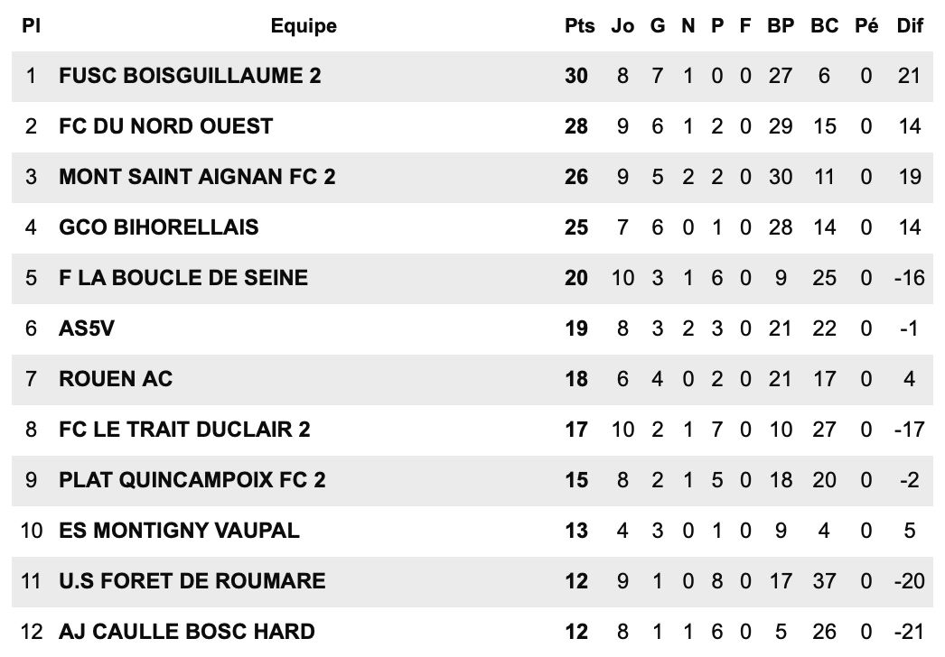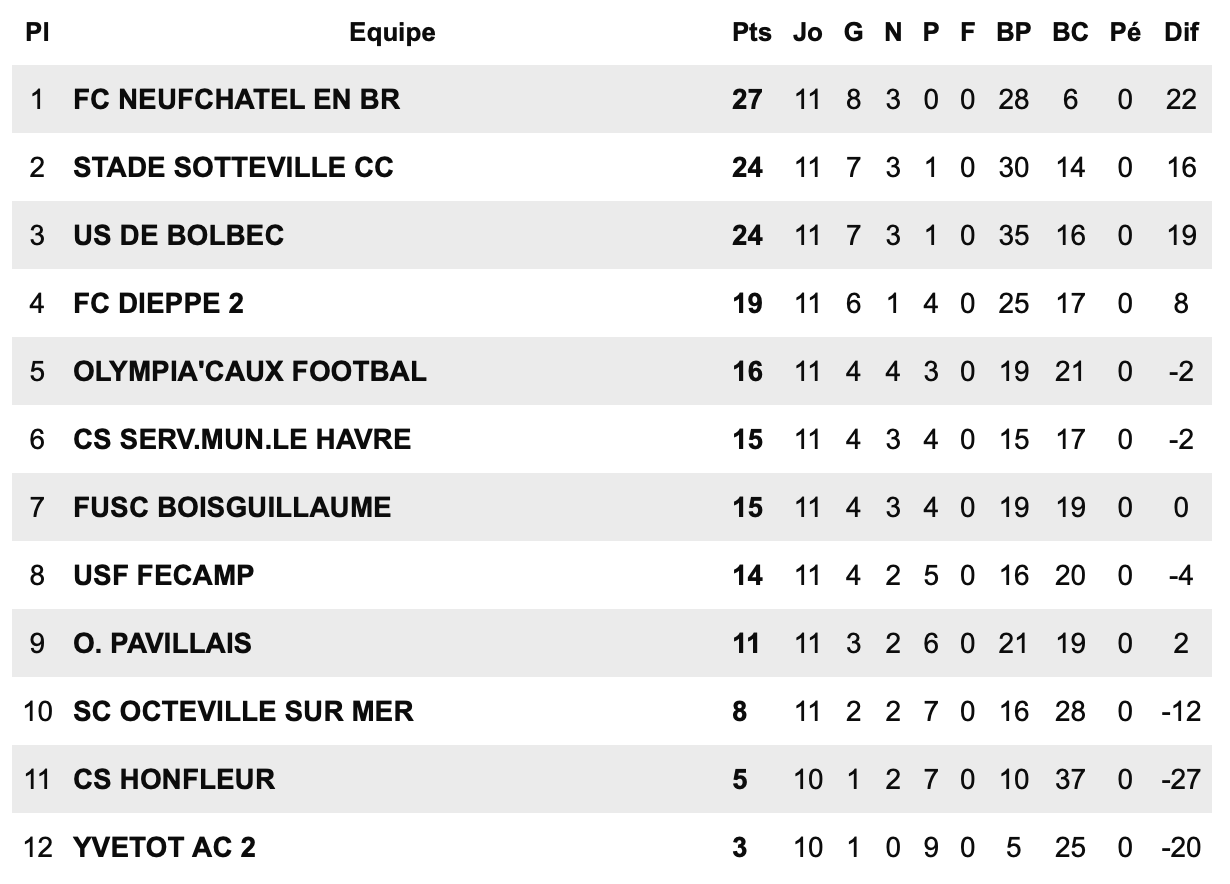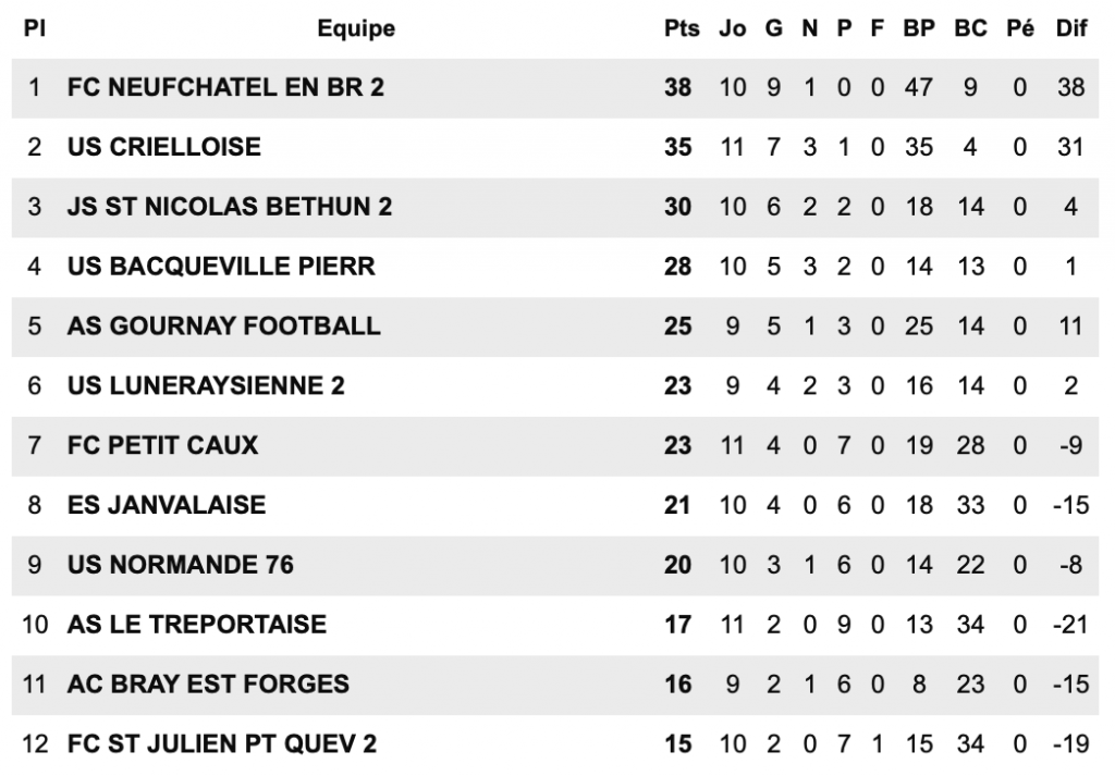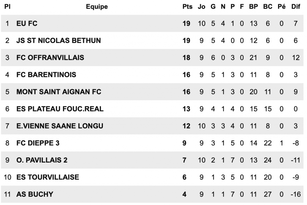 En Régional 2, notre représentant, le FC Neufchâtel-en-Bray, réalise un parcours remarquable. Leader invaincu de son groupe, le club dispose de trois points d’avance sur ses poursuivants, Sotteville et Bolbec. Malgré ces excellents résultats sportifs, les infrastructures ne sont toujours pas à la hauteur des ambitions neuchâteloises. Aucun projet concret ne semble à l’étude pour améliorer la situation, ce qui pourrait peser dans la course à la montée. Les supporters croisent néanmoins les doigts pour une accession en fin de saison.