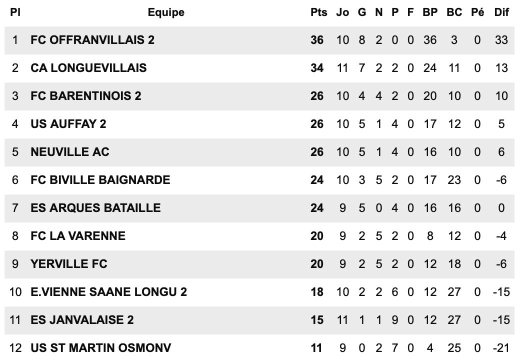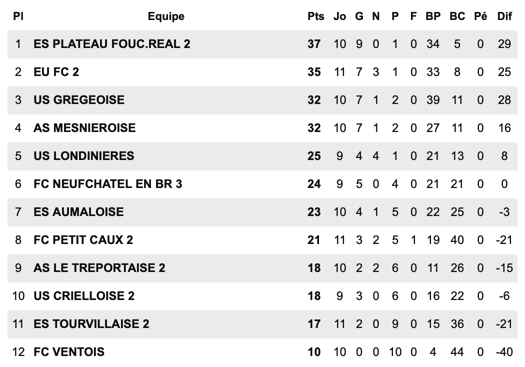 En D2, groupe A, l’ES Plateau FR B occupe la première place devant l’Eu FC. L’AS Mesnières-en-Bray réalise une belle saison et se classe 3ᵉ à égalité avec Grèges. L’US Londinières, malgré un potentiel certain, pointe à la 5ᵉ place. Neufchâtel C est 6ᵉ, suivi de l’ES Aumale, tandis que le FC Ventois, en plein renouveau, ferme la marche du classement.