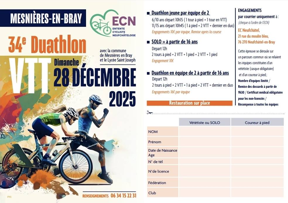 L’Entente Cycliste Neufchâteloise donne rendez-vous aux sportifs et amateurs de spectacle pour la 34ᵉ édition du Duathlon de Mesnières-en-Bray, qui se tiendra dans le cadre exceptionnel du parc du château.