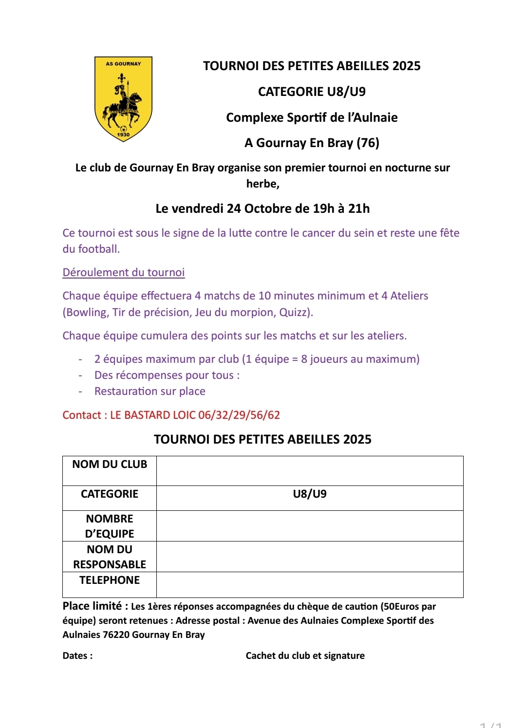 Dans le cadre d’Octobre Rose, l’AS Gournay-en-Bray lance une belle initiative en organisant son premier tournoi en nocturne sur herbe destiné aux catégories U8/U9. L’événement se tiendra le vendredi 24 octobre 2025, de 19h à 21h, sur les installations de l’AS Gournay en Bray (complexe sportif de l’Aulnaie).
